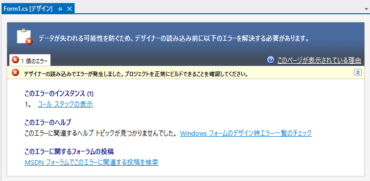 .NETベースでWinFormアプリを作成しようとすると、デザイナー表示でエラーになる。