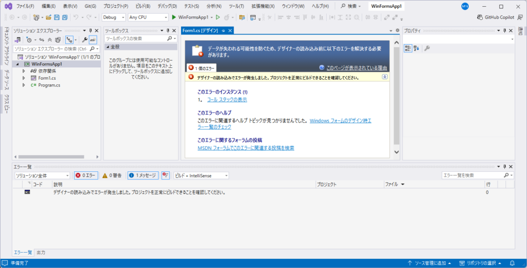 ⑤ VisualStudioが表示されるが、デザイナーがエラー表示…