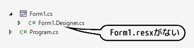 でも、よく見るとFormに付属しているはずの.resxファイルがソリューションツリーに表示されないので、これが原因なのかもしれない