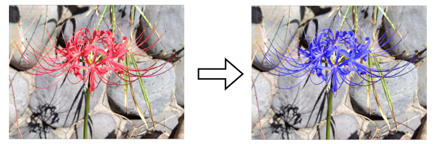 ↑では左下の枯草(茶色)も青っぽくなってしまっていますが、選択範囲を花の部分だけにして変換すれば、花だけの色を変更できます。