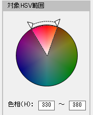 対象HSV範囲の色相を変更したい元の色(赤)を含む範囲(330~380もしくは-30~20)を指定し、